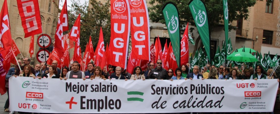UGT Servicios Públicos, el Área Pública de CCOO y CSIF se concentraron el 30 de octubre frente a las subdelegaciones del Gobierno en Castilla-La Mancha. Demandaron servicios públicos de calidad, incrementos salariales, más empleo y mejores condiciones laborales para unos 130.000 empleados públicos en la región y más de tres millones y medio en todo el país.